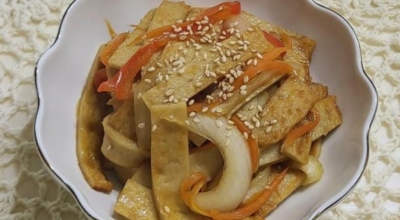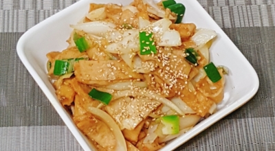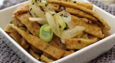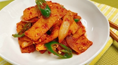 재료 : 어묵(동그란어묵, 막대어묵, 사각어묵) 300g 대파 1/2대, 양파 1/2개, 붉은 고추 1/2개, 청양고추 1/2개 식용유 3큰술, 간장3큰술, 고춧가루 1과1/2 큰술, 다진 마늘 1 큰술, 맛술 2 큰술, 설탕 1 큰술, 통깨 1 큰술