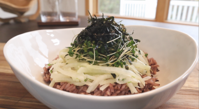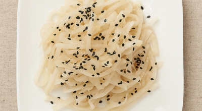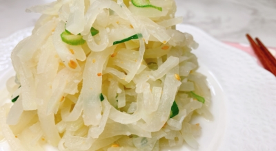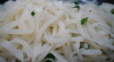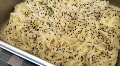 재료 : 무, 다진 마늘 반 큰술, 들기름 반 큰술, 소금, 양조간장 반 큰술, 참기름 반 큰술, 무 크기로 썬 파, 통깨 반 큰술, 검은깨 약간