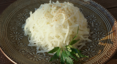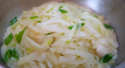 재료 : 무 3컵, 대파 2스푼, 간 마늘, 진간장, 설탕, 들기름, 깨소금, 쌀뜨물 1/2컵.