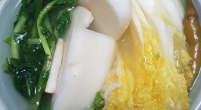 다른 그릇에 동치미 국물을 만든다 물(육수) 5L+ 소금 1컵을 넣고 젛으면 되어요. 보관할 김치통에 양염을 넣은 천 주머니를 넣고 그 위에 절여둔 무를 차곡차곡 담은 다음, 배, 쪽파와 갓의 순서대로 넣고 돌로 눌러놓습니다. 만들어둔 동치미 국물을 붓습니다.