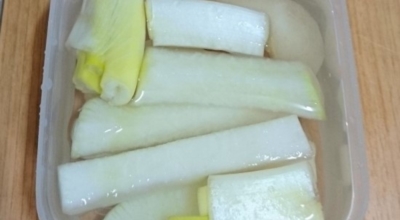 겨울무는 껍데기가 있는 채로 깨끗하게 씻고 사방 1.5cm 손가락 굵기로 세로 썰기를 해요. 먹기 좋게 손가락 크기 정도로 썰어줍니다. 생수 500ml에 천일염 3큰술을 넣고 멸치액젓 3큰술, 매실청 3큰술을 넣고 잘 섞어줍니다. 절임물을 썰어둔 무에 부어줍니다. 절임물을 부어서 모두에게 잘 섞어준 다음 2시간 정도 절여줍니다. 한 시간이 지난 뒤에 한번 뒤집어주며 총 2시간 절여줍니다.
