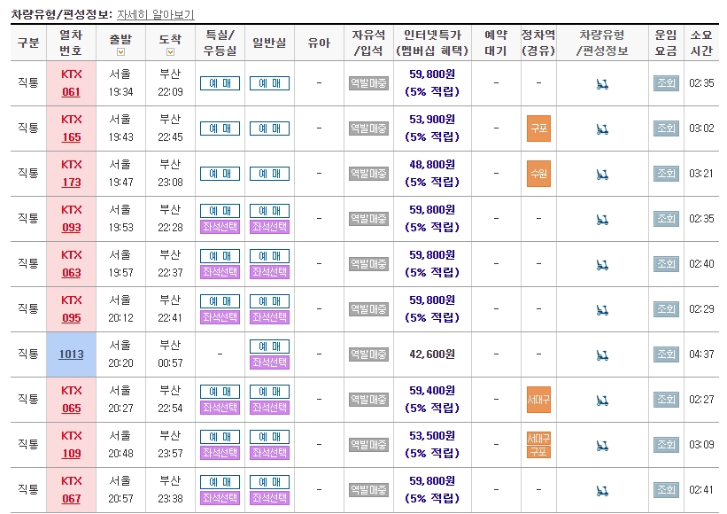 ktx열차 시간표 - KTX열차 예매 요금확인(서울에서 부산)