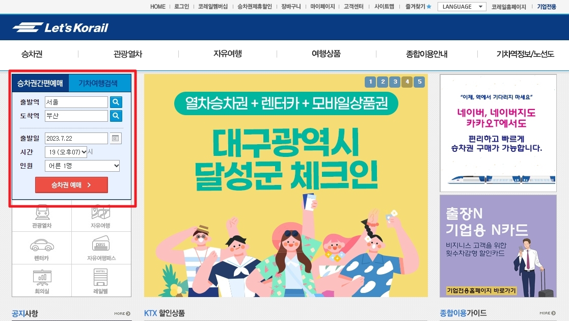 피씨 기준으로 살펴보면 홈페이지에 접속하면 좌측상단에서 간편예매를 확인되고 있습니다. 여기서 목적지와 출발일자를 선택하고 승차권 예매를 누릅니다.