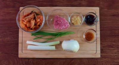 밥 2공기,김치 1컵,야채 1컵,돼지고기,닭가슴살 등(선택사항) 1컵,다진 마늘 2-3, 타당한 크기의 파 2-3개,간장 2~3큰술,참기름 한 큰술,고춧가루 또는 고추장(선택사항),계란 1-2개(선택사항),쌈장