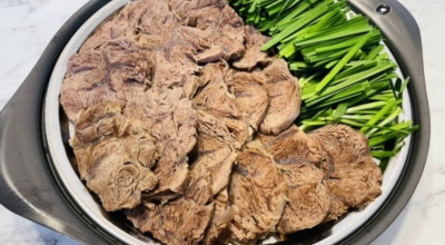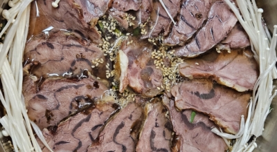 삶는 시간이 중요시되는데요. 끓는 물인 강불에 약 20분, 그리고 중불에 약 20분, 약불에 약 20분 총 60분가량을 삶아 주어요. (화력이 다르므로 중간에 젓가락등으로 삶기를 잘 체크해 주세요) 1시간 가까이가 됐을 때 젓가락을 넣었을 때 너무 말캉거리지 않고 부드럽게 들어가면 익은 것 이예요. (바로 건지지 마시고 5분 정도 뚜껑을 닫고 기다려서 조금 더 익을 수 있게 기다립니다) 건져낸 고기를 썰어주시면 되어요.