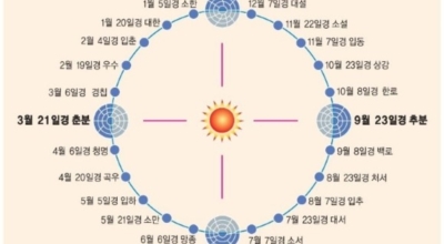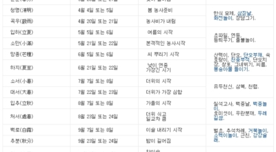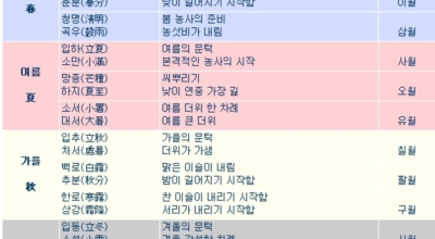 1달에서 5일을 1후, 3후인 15일을 1기라 해서 이것이 기후를 나타내는 기초가 됩니다. 1년을 12절기와 12중기로 나누어 보통 24절기라 하지만, 절기는 1달 중 월초에 해당하고, 중기는 월중에 해당합니다. 24절기에는 봄이 시작되는 입춘을 비롯해서 우수·경칩·춘분·청명·곡우·입하·소만·망종·하지·소서·대서·입추·처서·백로·추분·한로·상강·입동·소설·대설·동지·소한, 그리고 겨울의 매듭을 짓는 대한이 있습니다.