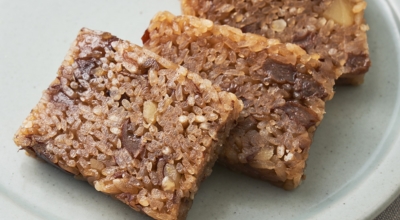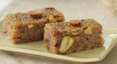 (10~15분 소요) 깊이가 낮은 용기에 전체적으로 참기름을 발라줍니다. 참기름 바른 용기에 약밥을 살살 눌러 담아 넣고 식힙니다. 용기를 뒤집어 약밥을 꺼낸 후 적당한 크기로 썰어줘요. 취향에 따라 돌돌 만 건대추와 잣을 고명으로 올리면 맛있는 약밥이 완성됩니다.