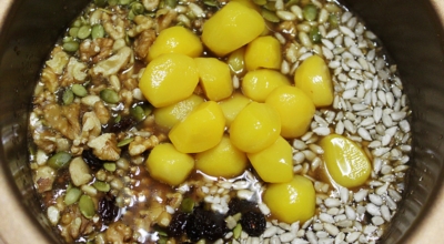 견과류 : 아몬드, 호두, 땅콩, 건포도, 은행, 호박씨, 잣, 씨앗 제거한 대추, 밤 등 100g 정도 넣으면 좋아요.