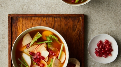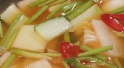 센 불에서 10분 끓인 뒤 약 불로 줄여 20분 끓여주시면 될 수 있다고 하네요. 30분간 끓인 채수는 체에 거른 뒤 차갑게 식혀주세요. 사방 2.5cm로 나박썰기한 배 200g, 채 썬 홍고추 100g, 마늘즙 3큰술, 생강즙 1 큰술을 넣어줘요.