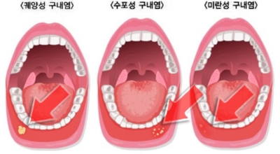 구강에 나타나는 통증을 동반하는 염증성 질환을 통틀어 구내염이라 해요. 그러나 구강의 점막에 나타나는 질환들은 다양하면서도 병변의 모양이 서로 비슷해서 감별진단에 어려움이 있기 때문에 세심한 병력청취와 관찰이 필요해요. 구내염은 증상별, 발생 부위별, 원인별, 이학적 검사 소견에 따른 여러가지 분류법들이 있으나 각 질환에 관해서 일률적으로 적용하기는 곤란해요. 그러므로 대부분 이들의 여러 분류법들을 혼합해서 분류하는 경우가 많다고 하며, 보통은 구내염은 궤양성 구내염, 수포성 구내염, 미란성 구내염으로 나뉩니다.
